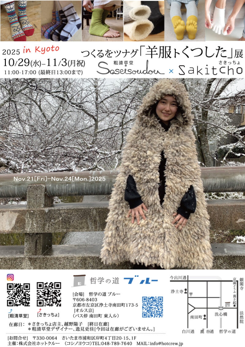 今年3度目となる京都は哲学の道ブルーでの展示会。北海道美深町の粗清草堂の羊服を中心に、さきっちょの靴下とご一緒にご紹介します。まるで羊と一体になったような肩の力がぬける着心地の良さと軽さを是非体感くださいませ。