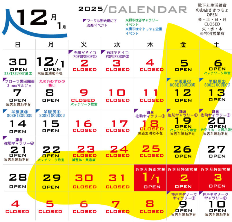 師走になりました。さきっちょの靴下は遠く沖縄石垣島でも愛され12月2,3日久しぶりの石垣「集うと憩う」さんでのPOPUPSHOPからスタートし7日はフローラ黒田園芸さんでのX’masマルシェ参加、2Fギャラリーでの羊服企画展、初の鎌倉佐助カフェギャラリーへと走ります!どこかでお会い出来たら嬉しいです。