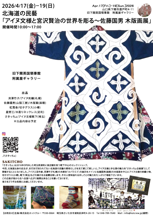 [4/17-19]山口下関へ北海道の民藝「アイヌ文様と宮沢賢治の世界を彫る~佐藤国男 木版画展」